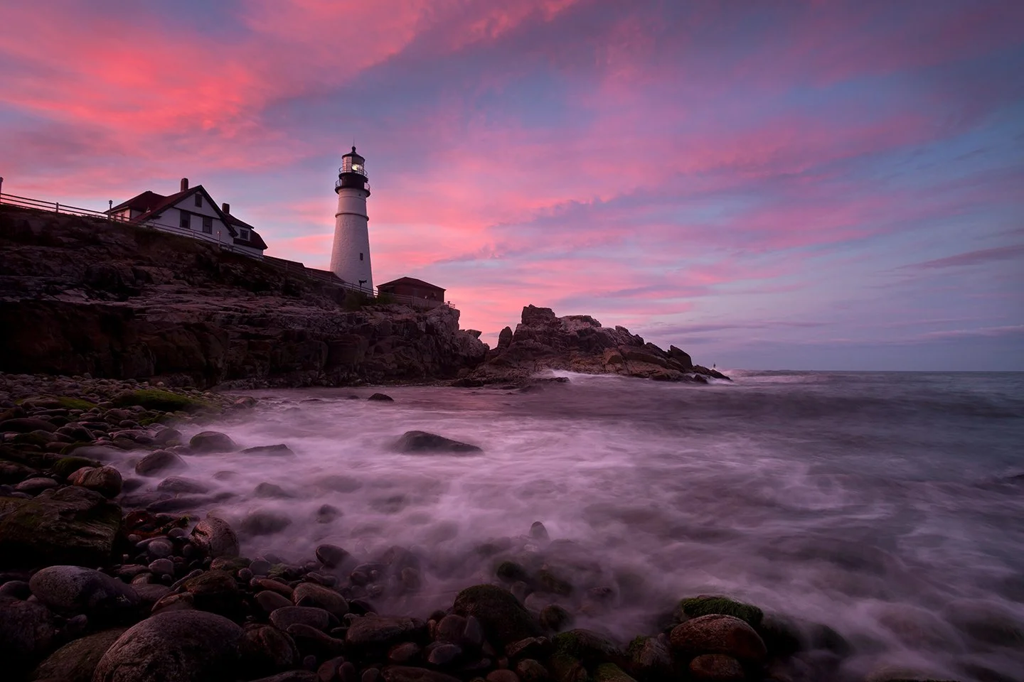 The setting sun was well behind me, but its colors wrapped around the whole horizon, so while facing North East, it still commanded the photo, and framed the visage of Portland Headlight in its lovely magenta hues.